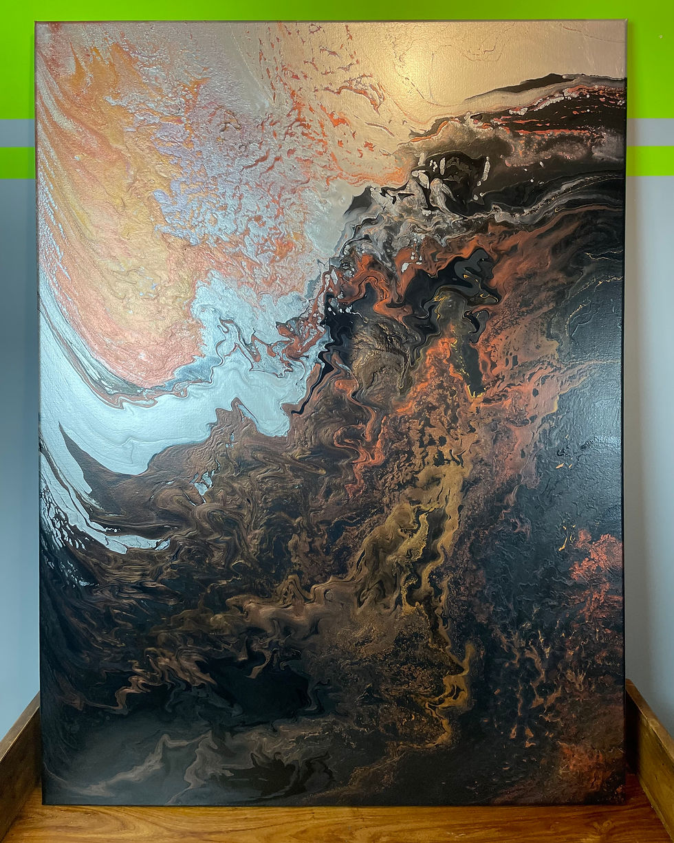 I began teaching art at the middle school and elementary level in 2018 because my love of drawing was something that had been with me my entire life. In 2020 during the beginning stages of the pandemic, I began painting with my wife and sister-in-law for fun. We would do Bob Ross tutorials and that eventually switched and my sister-in-law Courtney and I began doing abstract paintings.